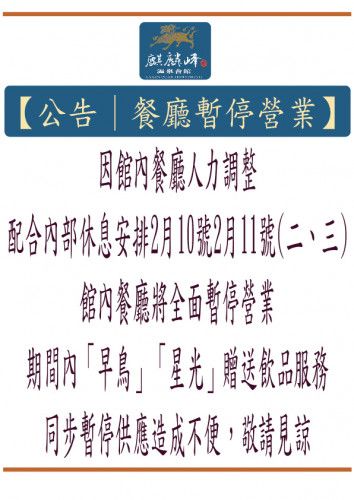 因館內餐廳進行人力調整 與內部休息安排 2月10、11日(週二、三) 館內餐廳將全面暫停營業 期間內 「早鳥」、「星光」贈送飲品服務 同步暫停供應 造成不便,敬請見諒!